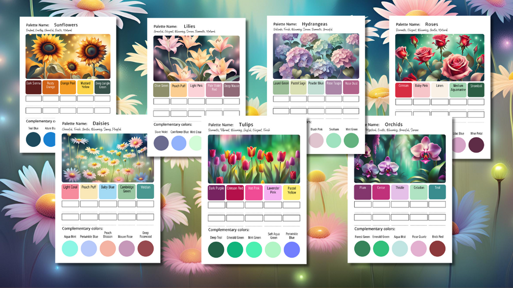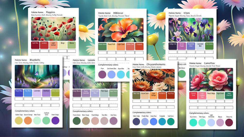 Let these palettes inspire you to create delicate floral designs, botanical illustrations, and nature-themed masterpieces! Whether you're working on a vintage floral aesthetic, soft watercolor blooms, or bold botanical patterns, this collection will help you achieve color harmony with ease.