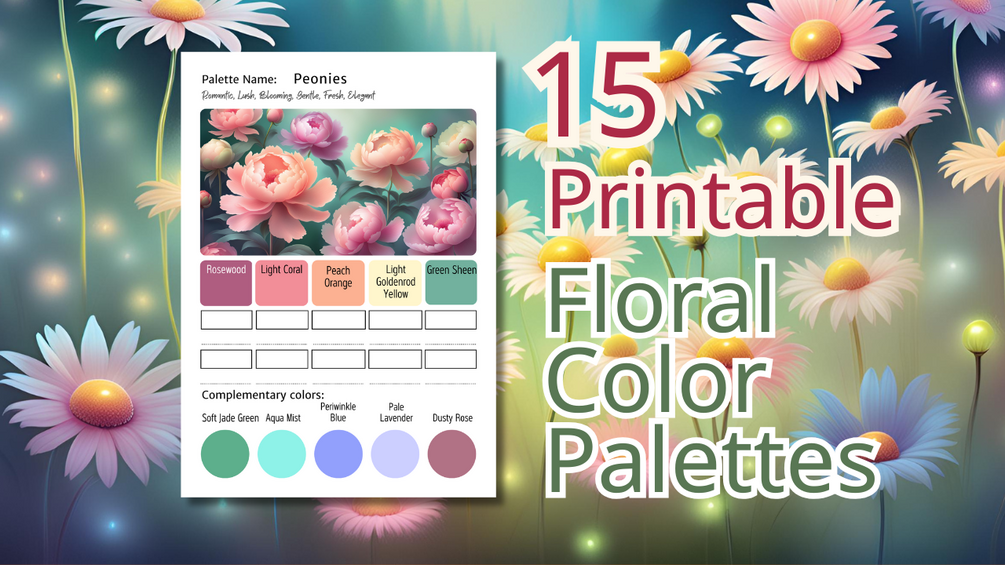 A printable bundle of 15 exclusive floral-themed color palettes, featuring emotional impact insights, reference drawings, swatch charts, and complementary colors—perfect for botanical illustrations, nature-inspired artwork, and delicate floral projects! 🌸🎨✨