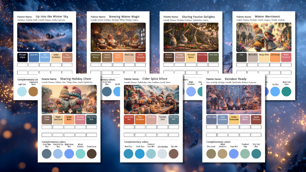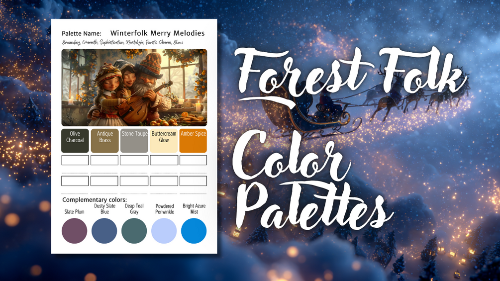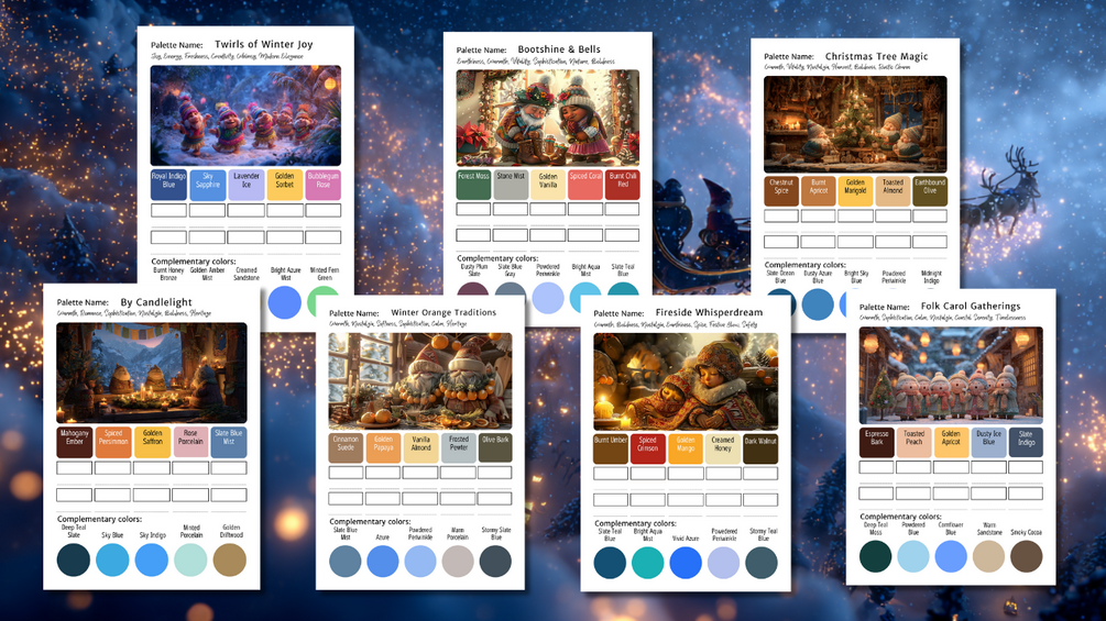 Let these holiday-inspired palettes โ and the magical Forest Folk who accompany them โ guide you in designing Christmas-themed illustrations, coloring books, crafts, and more. Whether you're working on cozy winter art or planning a festive masterpiece, these palettes are here to ignite your creative spark.