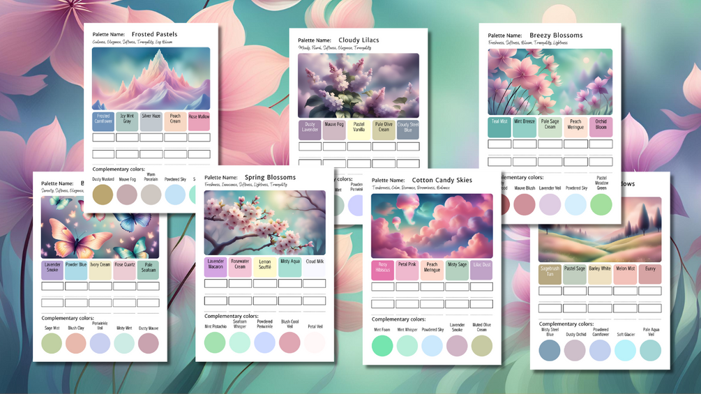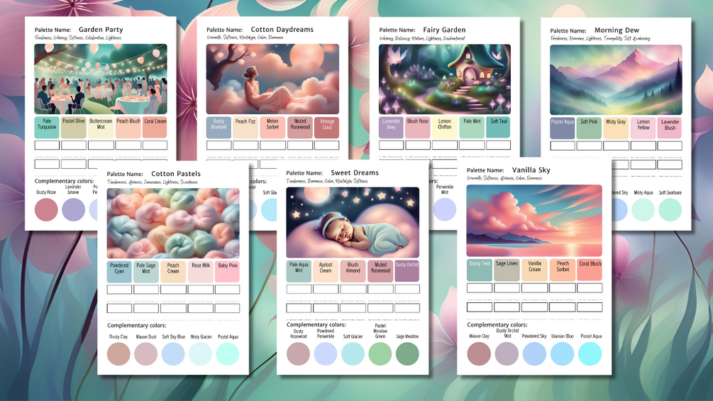Let these calming, inspiring palettes guide you in designing pastel-themed illustrations, soft fantasy art, crafts, and more! Whether you're capturing the charm of spring, fairytales, or dreamy aesthetics, this collection is here to help you bring your cutest, softest ideas to life!