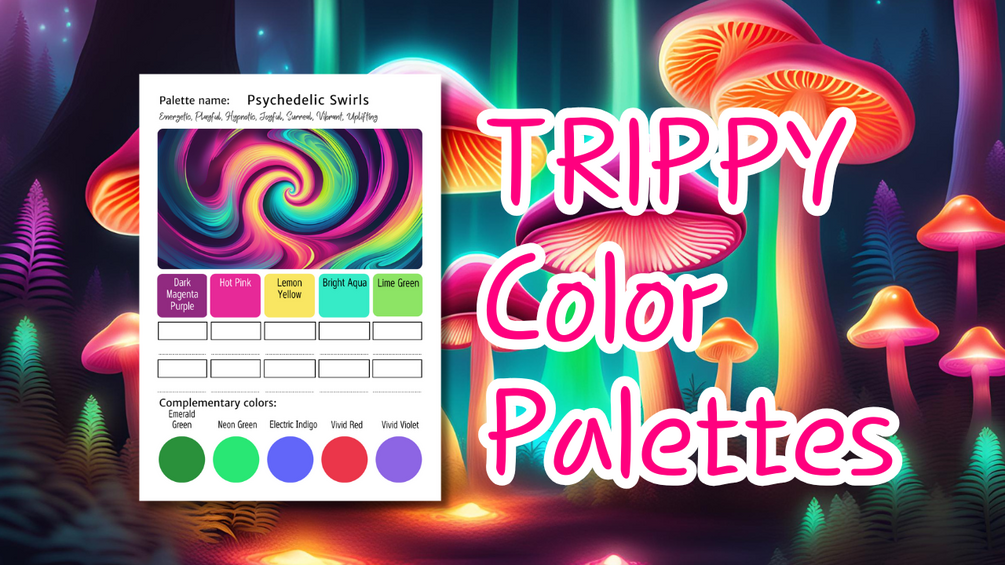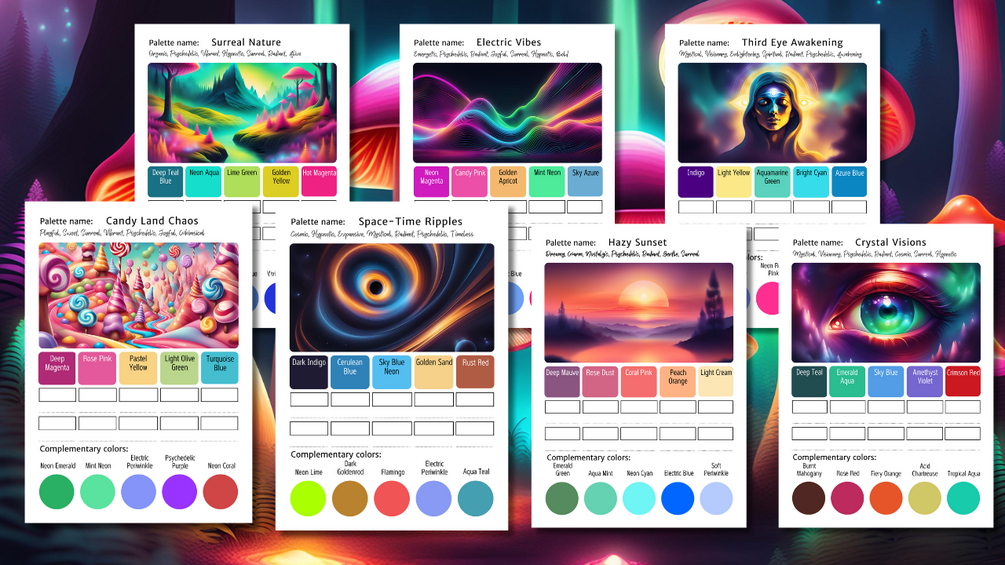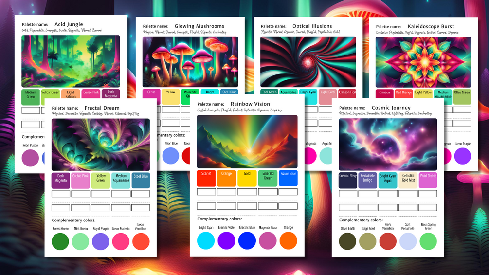 A printable bundle of 15 exclusive trippy-themed color palettes, featuring emotional impact insights, reference drawings, swatch charts, and complementary colors—perfect for bold, psychedelic art, neon dreamscapes, and mind-bending creative projects! 🌈🔮✨